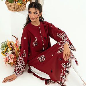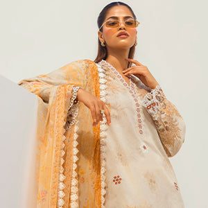 A soft kora cotton embroidered three piece designed in a relaxed straight silhouette for effortless everyday elegance. The shirt features delicate geometric embroidery scattered across the front and sleeves, finished with subtle detailing along the hem for added refinement. Paired with a relaxed shalwar that offers comfort and graceful movement, and a lightweight dupatta with coordinated accents, this ensemble feels timeless, airy, and perfect for polished daytime wear.