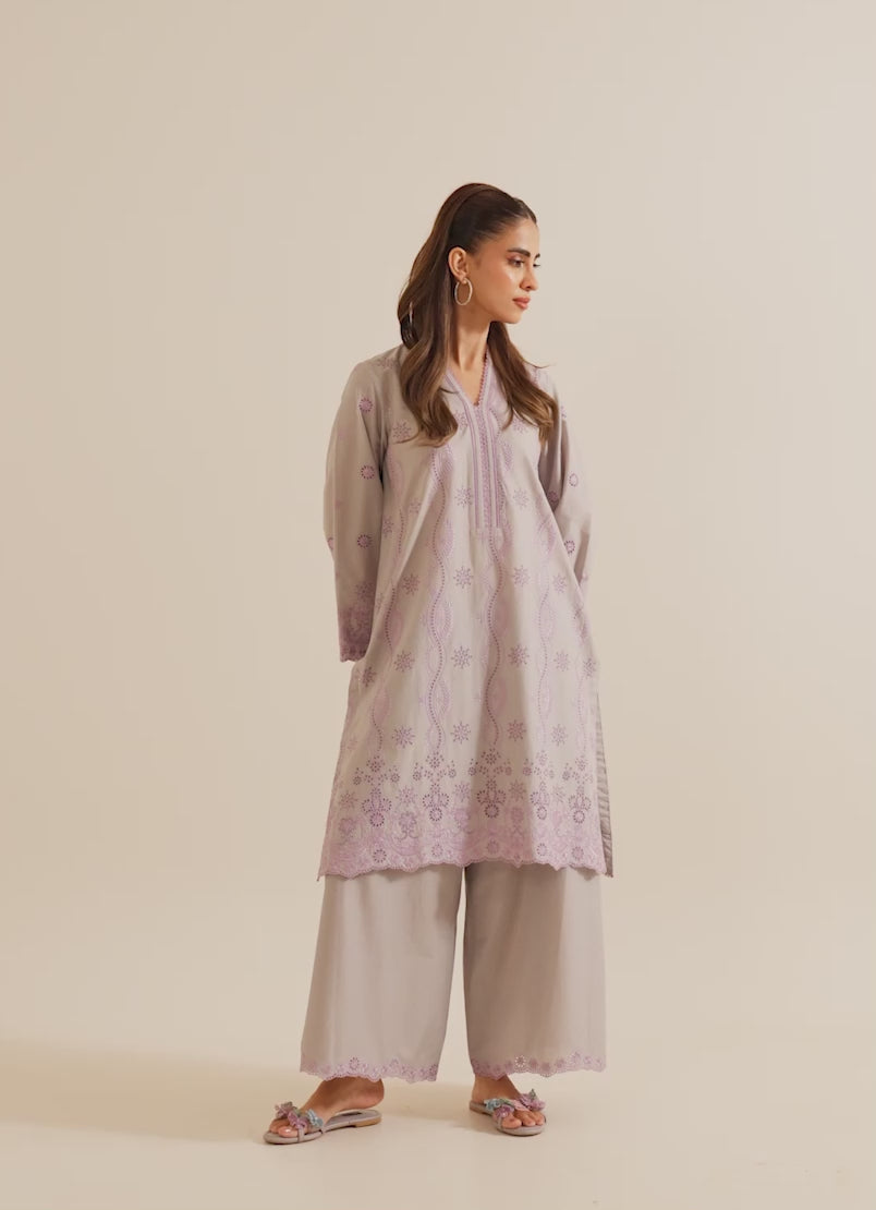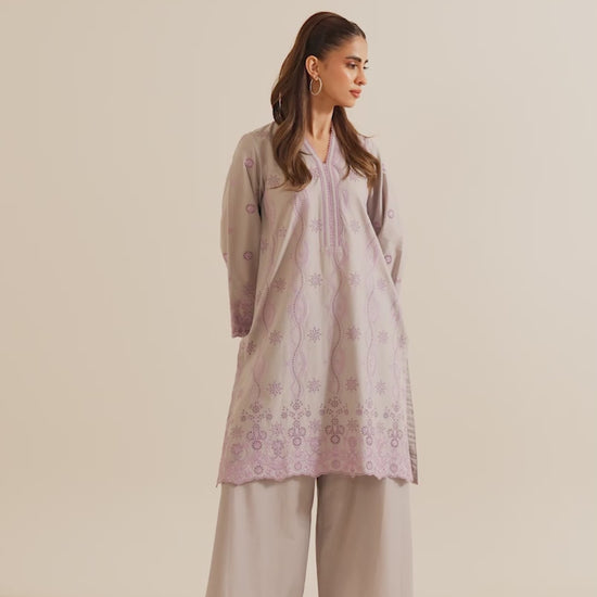The Grey Cotton Embroidered Co-ord Set from our Image Signature category features a V neckline & full-length bell sleeves paired with embroidered trousers.