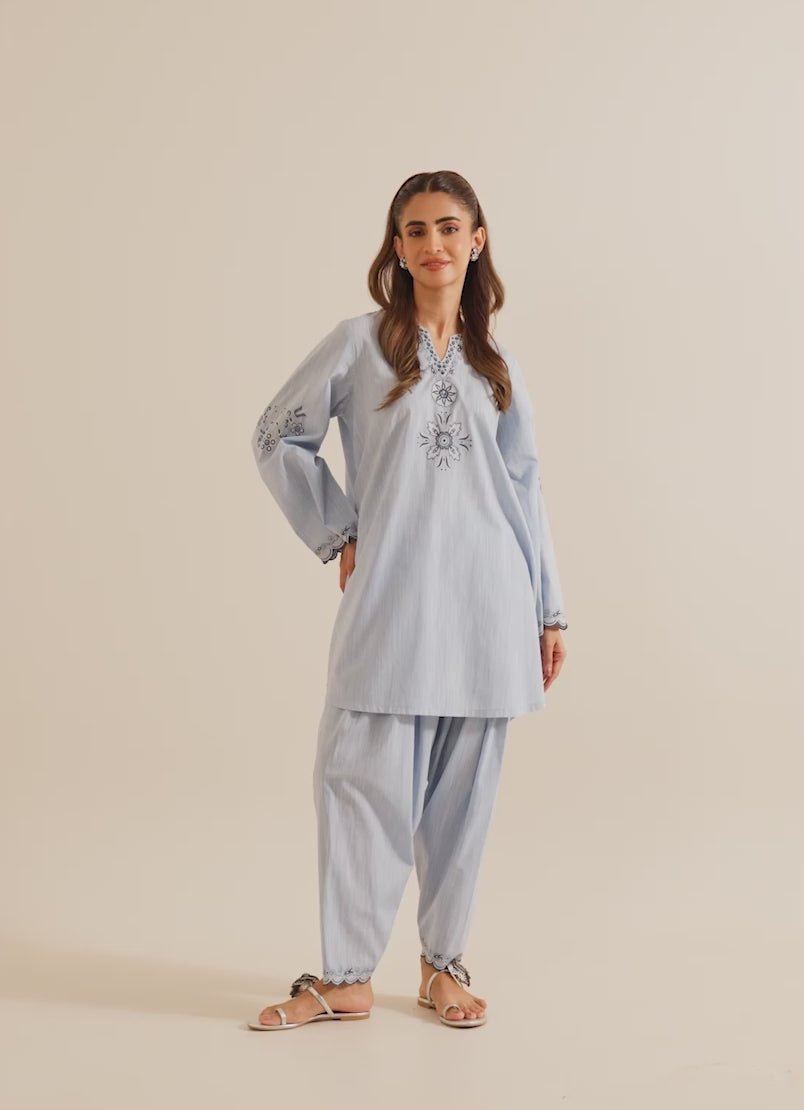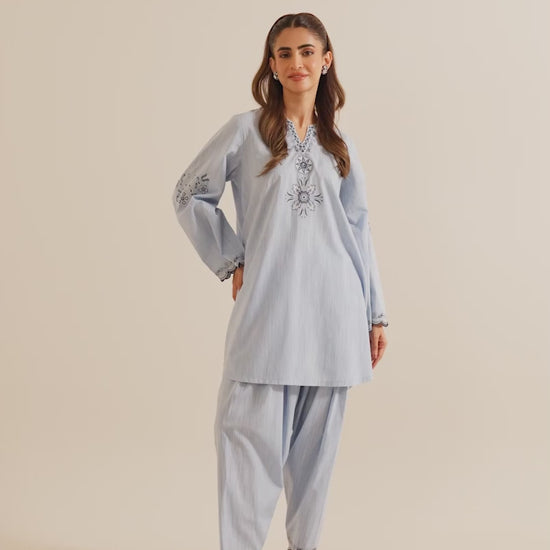 The Light Blue Yarn Dyed Embroidered Co-ord Set from our Image Daily category features an A-line shirt, round neckline with a slit & full-length bell sleeves paired with an embroidered shalwar.
