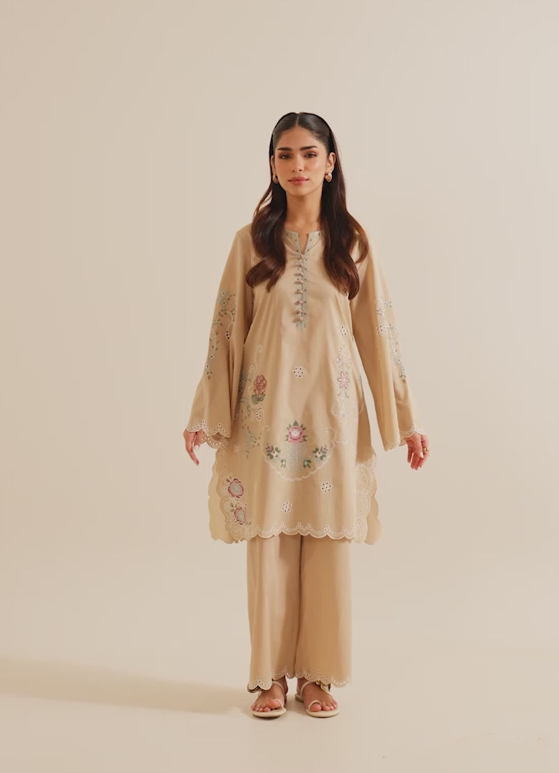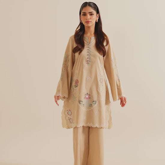 The Sandy Brown Cotton Embroidered Co-ord Set from our Image Signature category features a round neckline with a slit & full-length bell sleeves paired with embroidered trousers.