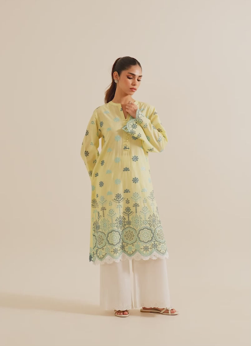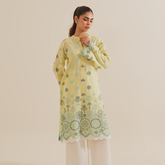 The Lemon Yellow Cotton Embroidered Kurta from our Image Signature category features band collar & full-length bell sleeves.